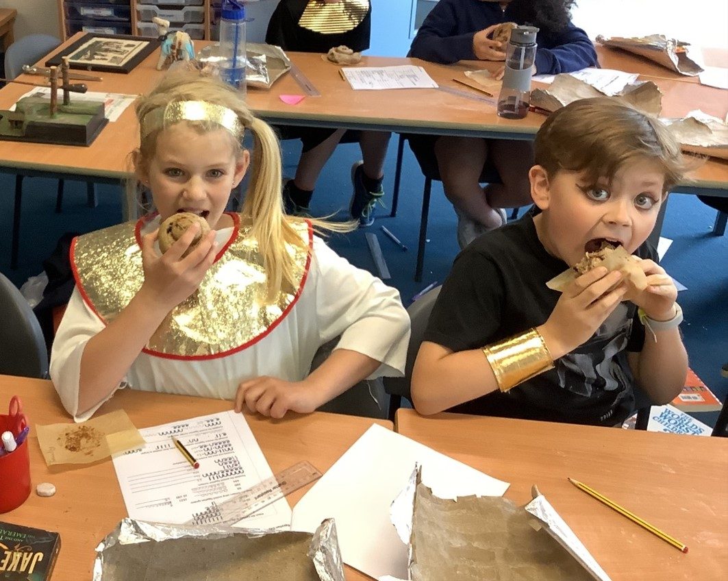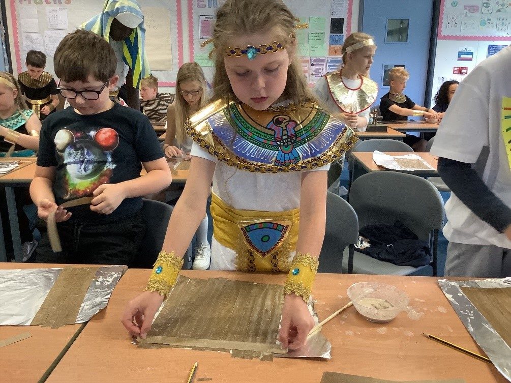 Year 5 had Egyptian day last Friday! We baked Egyptian bread (which was very yummy) and made a special type of Egyptian paper called papyrus paper, which we then wrote our names on! We also got to take a virtual tour of some of the most famous Egyptian tombs, which was very exciting. We all wore our best Egyptian costume and had a lot of fun learning about our topic!
