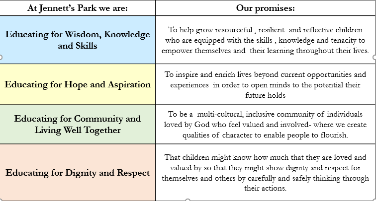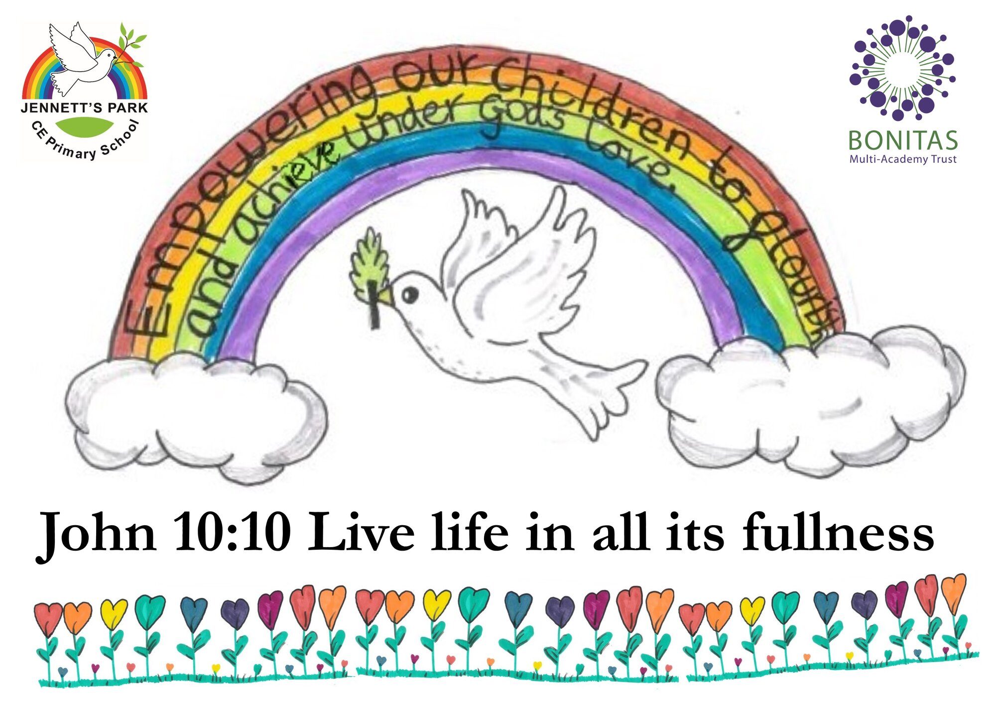 Our vision as a school, is to have every child achieving their greatest potential academically, socially and spiritually. We say we wish to Empower children to flourish and achieve under God's Love and that we will Live life in all its fullness ( John 10:10) LIAIF- Life in all its Fullness | Jennett's Park