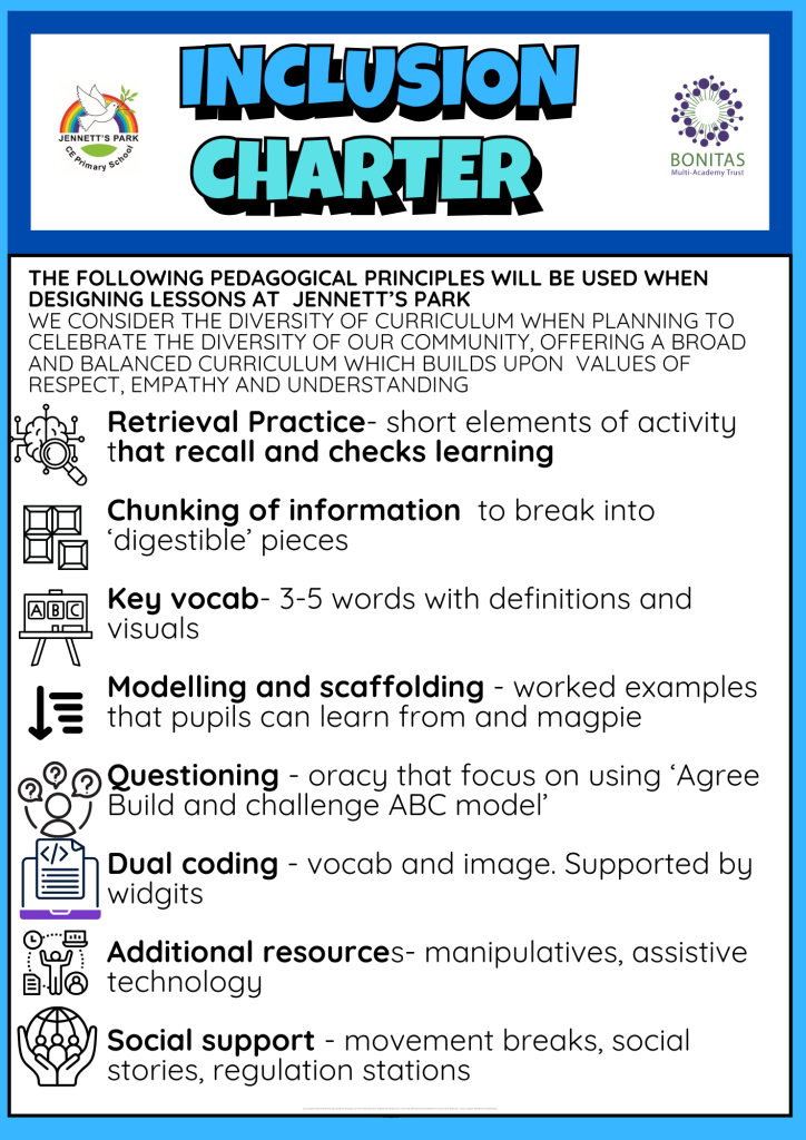 At Jennett’s Park CE Primary School, information about the school’s SEND provision and how it is implemented can be found in the SEND Policy and the Schools Local Offer . In combination, these two documents serve the purpose of the SEND Information Report and comply with the statutory requirement laid out in the 2014 Special Educational Needs and Disabilities (SEND) Code of Practice: 0 to 25 years. Our School Local Offer gives further information about how the policy is implemented at Jennett’s Park.