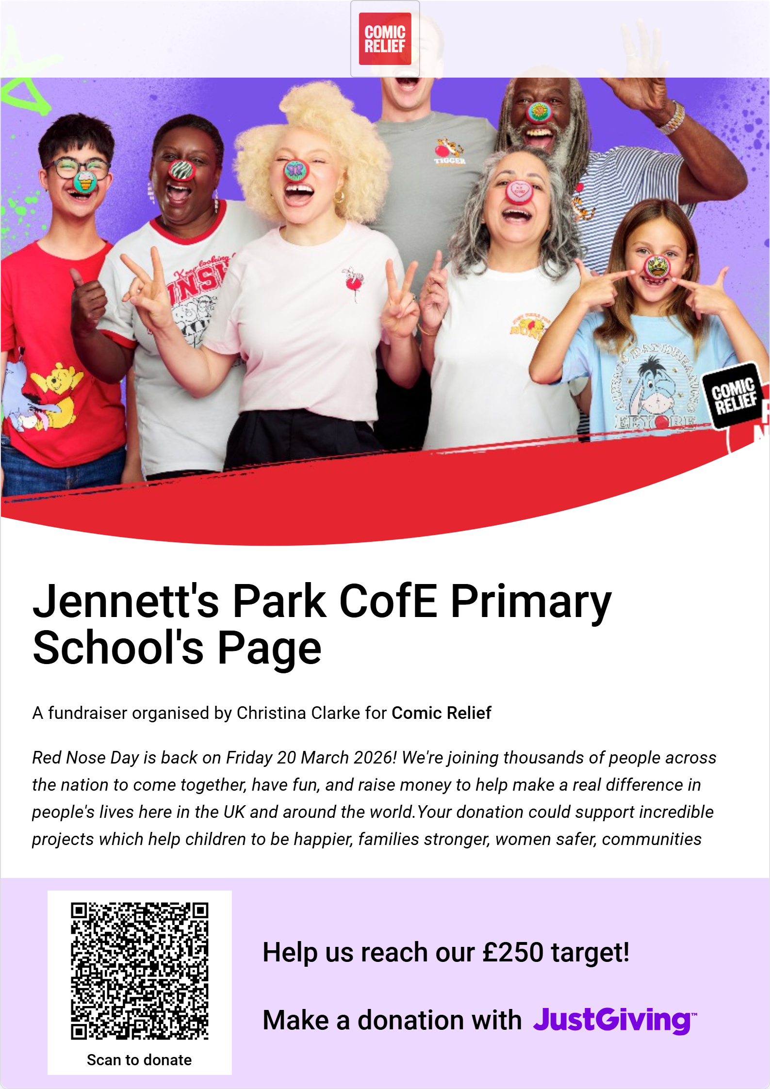 This year we will once again be supporting this amazing cause on Friday 20th March. The theme for 2026 is ‘Take Yourself Funny for Money’ and we would like to encourage children to come to school wearing red or in their funniest outfit, in exchange for a voluntary donation. Donations can be made via the school’s Comic Relief Just Giving online using the link attached.
